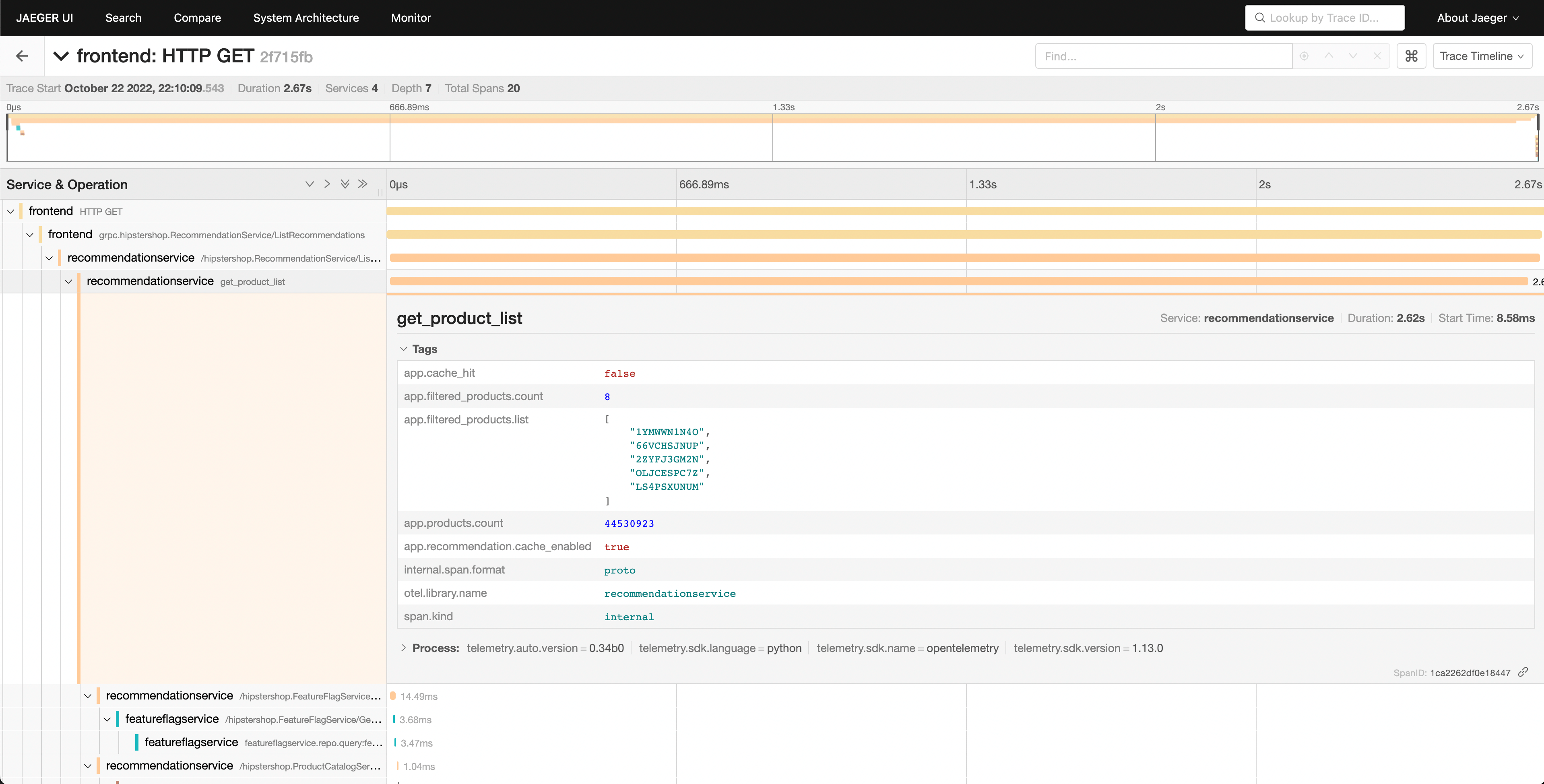Jaeger allows us to search for traces and display the end-to-end latency of an entire request with visibility into each individual part of the overall request. Perhaps we noticed an increase in tail latency on our frontend requests. Jaeger allows us to then search and filter our traces to include only those that include requests to the recommendation service.